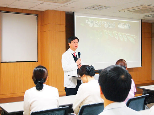 월례조회에서는 병원장님의 말씀과 이번에 새롭게 부임하시는 김성재 명예원장님의 소개가 있었습니다.