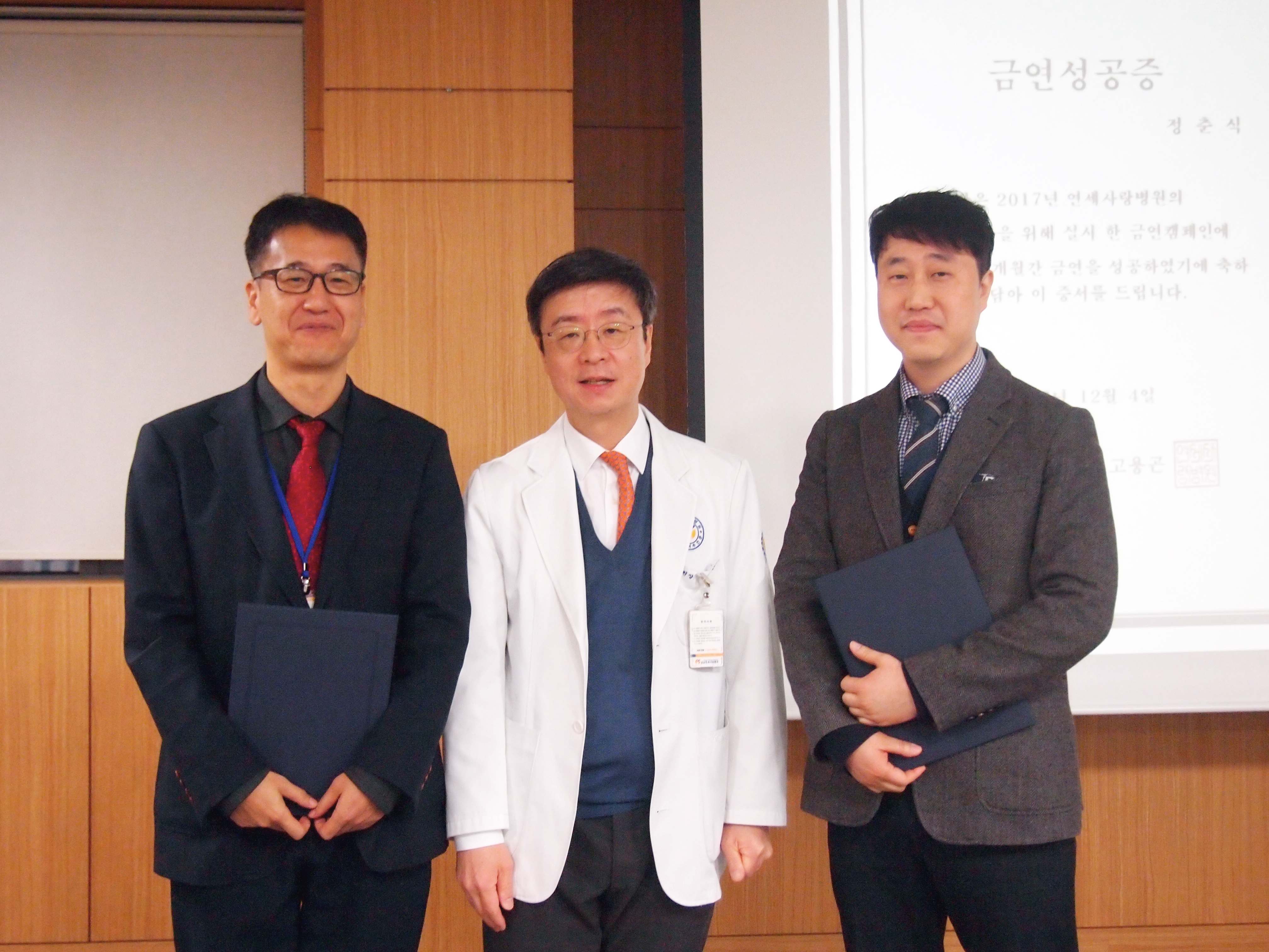 특히 지난해 금연을 선포하여 올 해까지 금연을 성공한 직원들에 대한 포상식을 진행하였고, 총무부장과 원무과장께서 금연 성공에 대한 포상을 받았습니다.