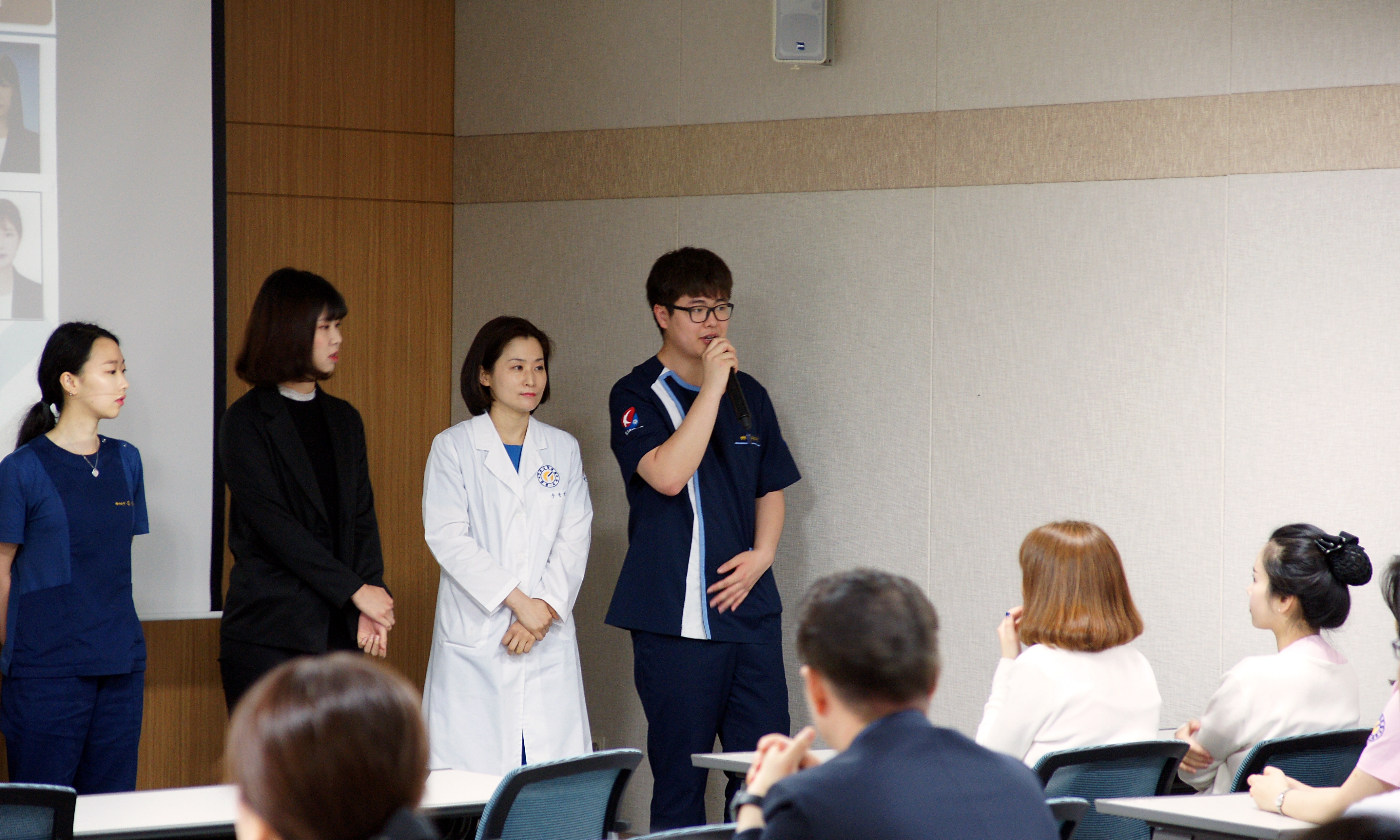 총 6명의 우수사원 중 정영호 구매과장이 대표로, 싱가포르 의료계의 상황을 설명하고 연수과정을 설명했습니다.