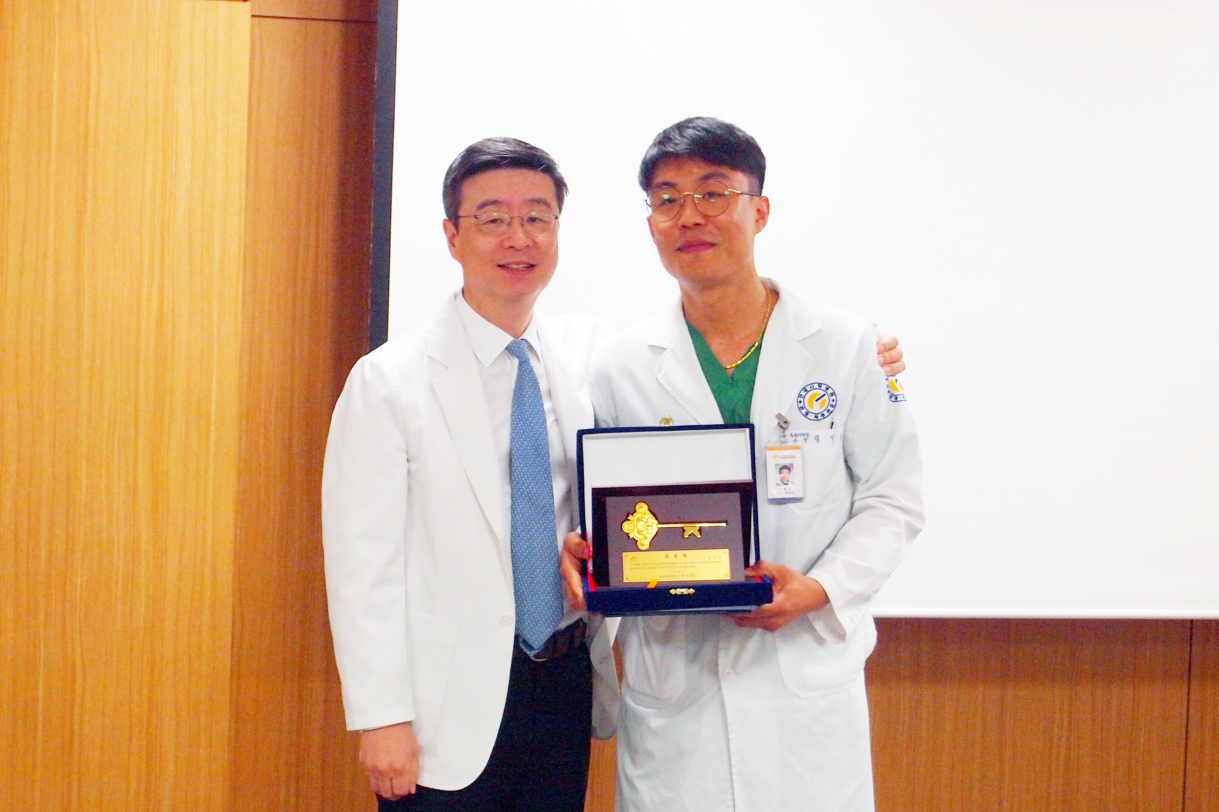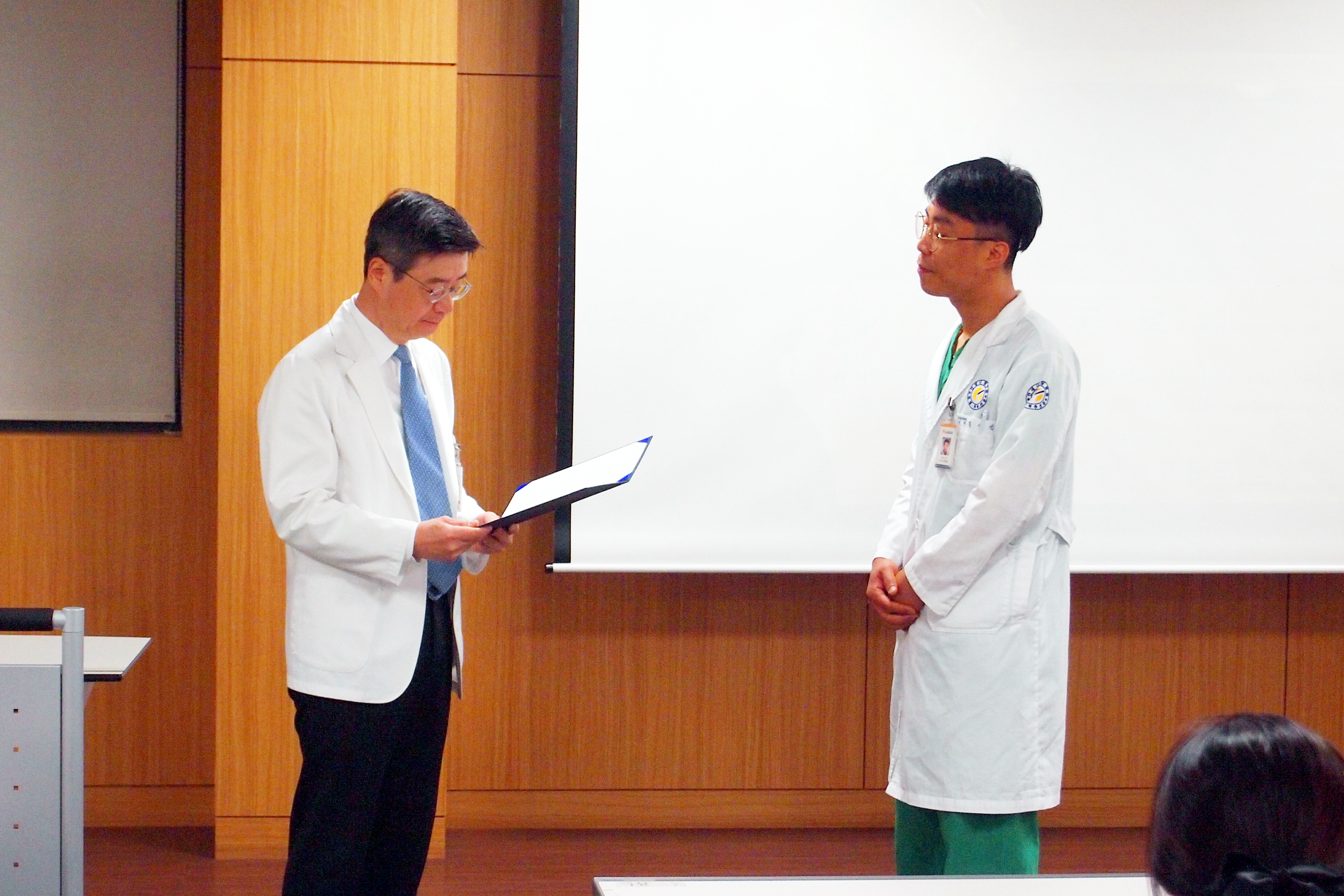 수술지원팀 김상선 과장이 '10년 만근자'로써 공로패를 수여받았습니다.
