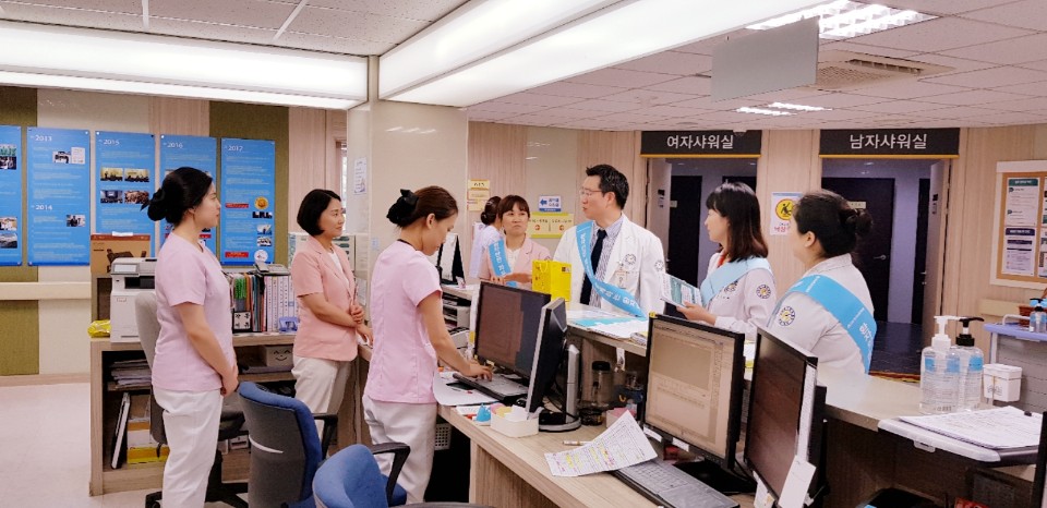 본원은 환자안전 및 감염관리에 대한 인식을 높이고 안전한 병원환경을 만들기 위해, 부원장, 관리부장, 총무부장, 간호부장, 감염관리실 부실장, QI전담 참석 하에 2018년 7월 5일(목) 「환자안전 & 감염관리 경영진 라운딩」을 실시하였습니다.