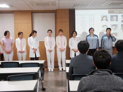 이 날 조회에서는 친절사원 포상 및 이달의 생일자 포상, 신입직원 소개가 있었습니다.